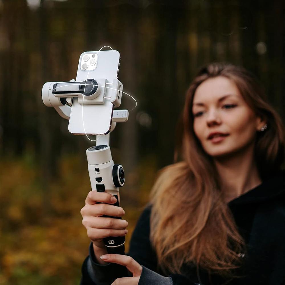 Oś obrotu umożliwia ekstremalne kąty (niski/wysoki/360°). Idealne do vlogów w ruchu, akcji i płynnych ujęć – obsługuje iPhone 15 Pro Max, Samsung S23 Ultra i Pixel 8 Pro (do 300g).