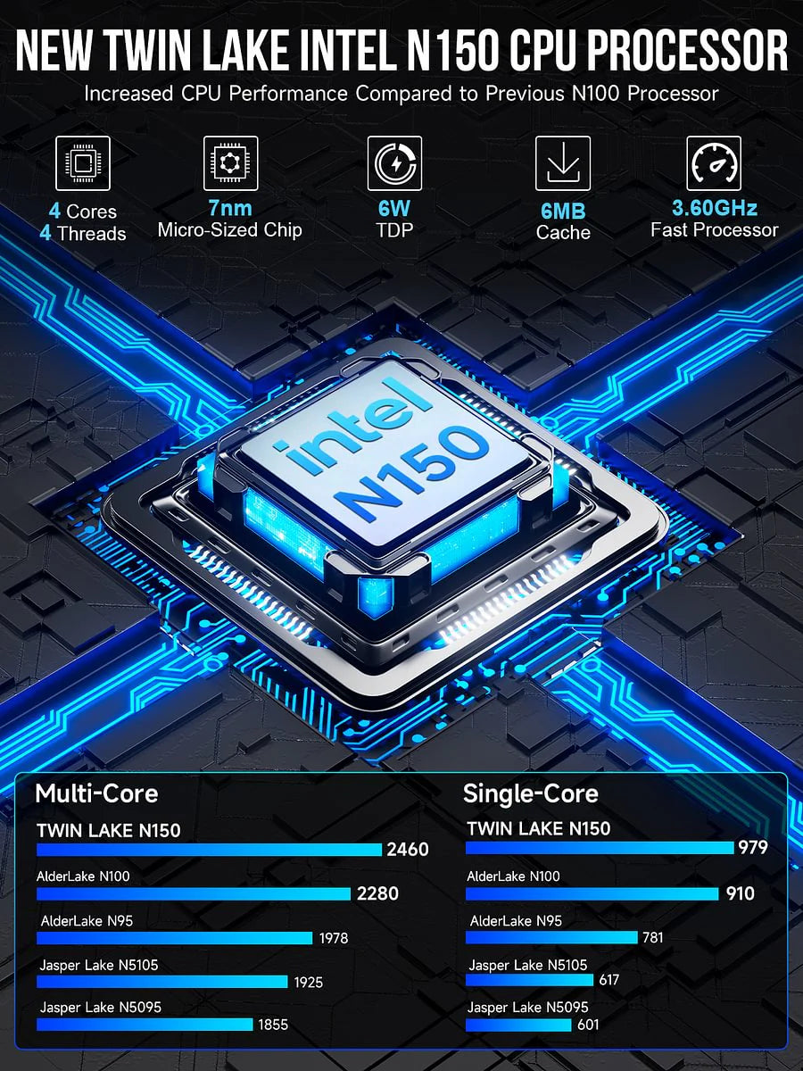 (1) Wydajność CPU Intel N150: Do 3.6GHz z Grafiką Intel UHD, idealny jako serwer osobisty, router lub centrum multimedialne.