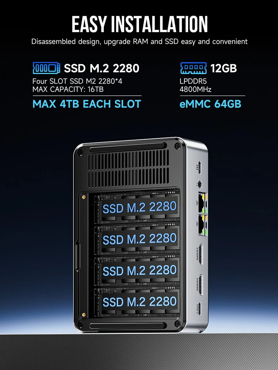 (2) Masowe Przechowywanie i Rozszerzalność: Cztery sloty NVMe M.2 2280 obsługujące do 16TB łącznie (4x 4TB), idealne do kopii zapasowych i hostingu plików.