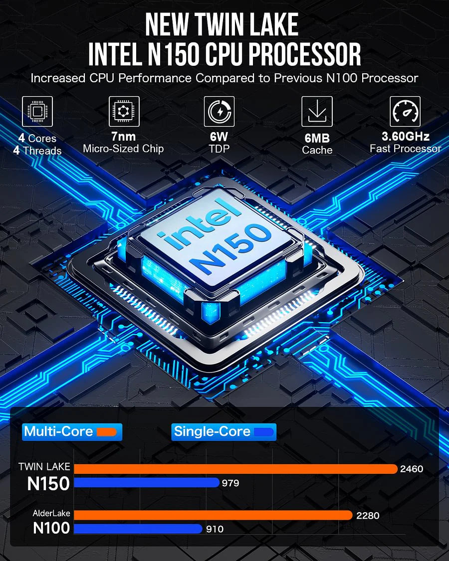 (1) Procesor Intel Twin Lake N150: 4 rdzenie/4 wątki, do 3.6 GHz, idealny do komputerów biurowych i domowych.