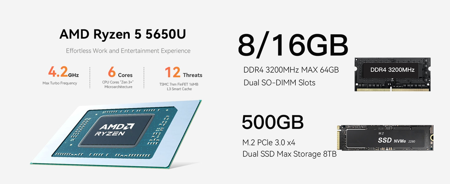 (1) AMD Ryzen 5 5650U: 6 rdzeni/12 wątków (do 4.2GHz) z grafiką Radeon do płynnego wielozadaniowania, streamingu 4K i codziennej wydajności.