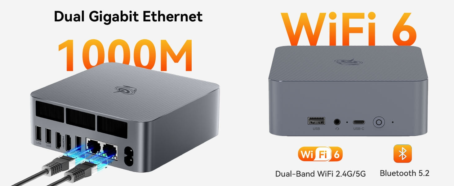 (4) WiFi 6 i Dual Gigabit LAN: WiFi 6 (do 2.4Gbps) i podwójne porty Ethernet. Bluetooth 5.2 dla stabilnych połączeń.